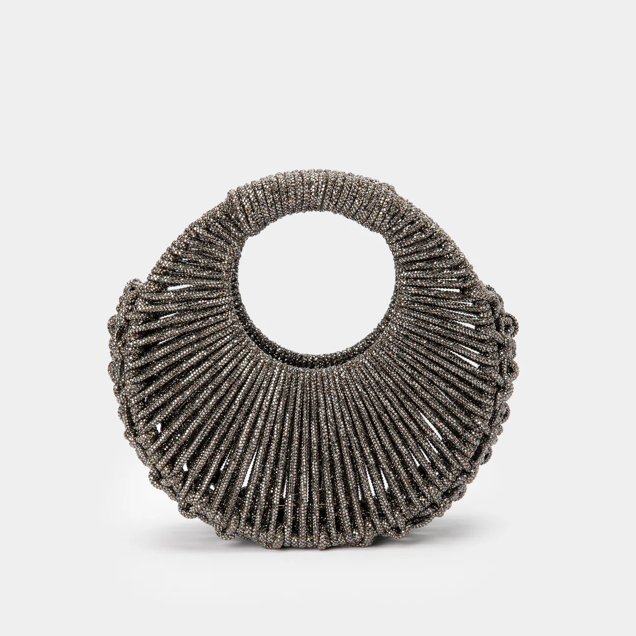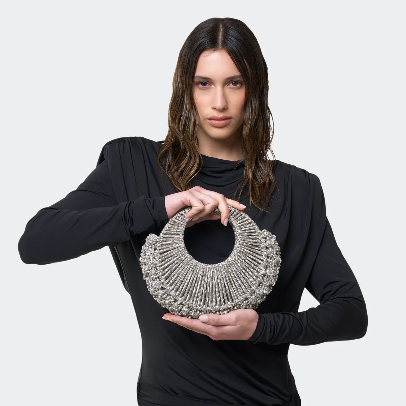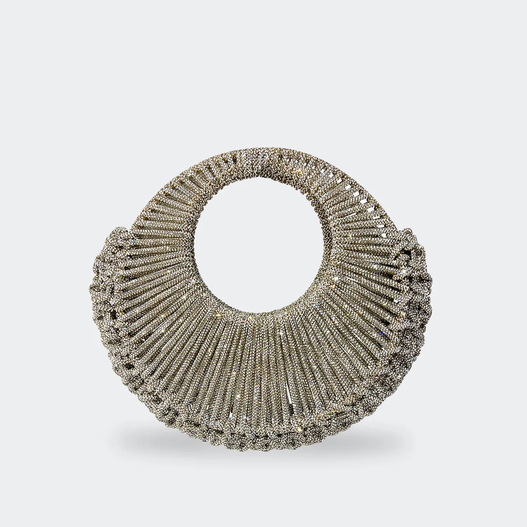The Jaya jewel bag is the new must-have accessory of the season. Handcrafted, it mixes craftsmanship and ultra chic design. Its circular shape and sparkling crystals make it perfect to shine on every special occasion.