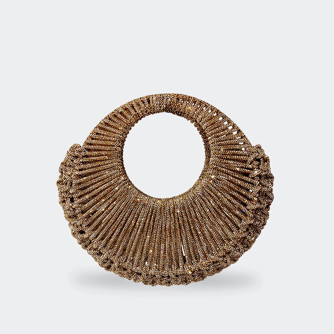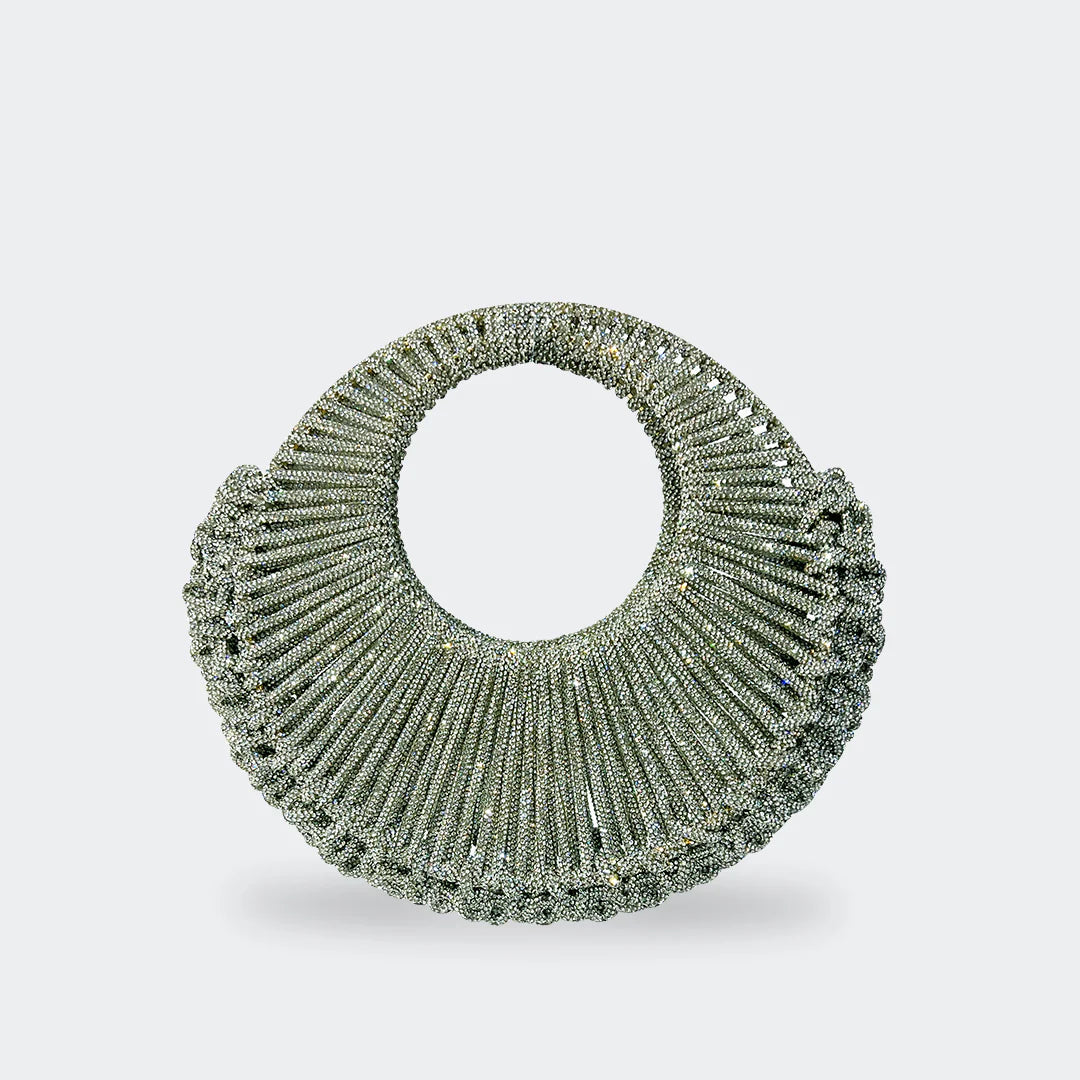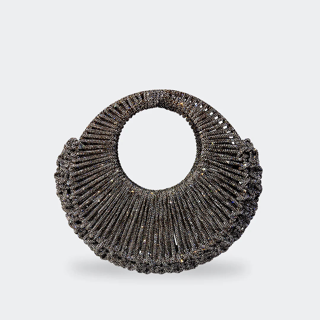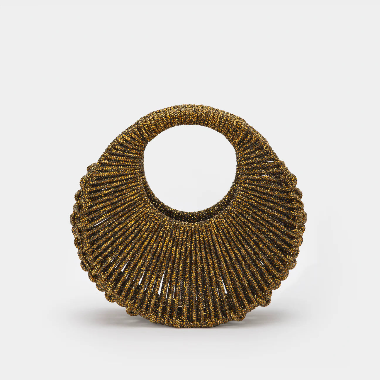 The Jaya jewel bag is the new must-have accessory of the season. Handcrafted, it mixes craftsmanship and ultra chic design. Its circular shape and sparkling crystals make it perfect to shine on every special occasion.
