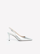 The Atlante slingback, crafted in silver laminated leather, blends clean lines with modern elegance. The pointed toe enhances the silhouette, while the small side buckle ensures a comfortable, feminine fit. The 7 cm heel adds balance and shine.
