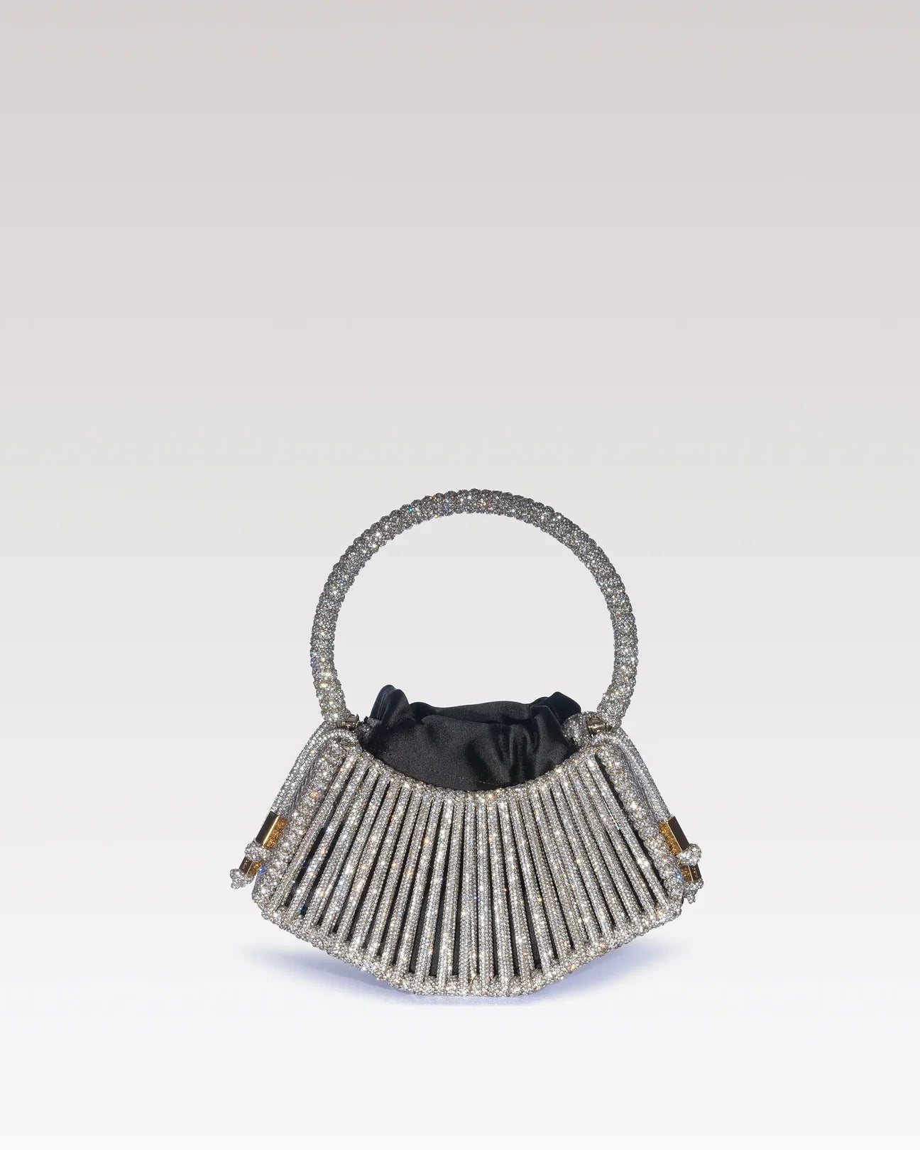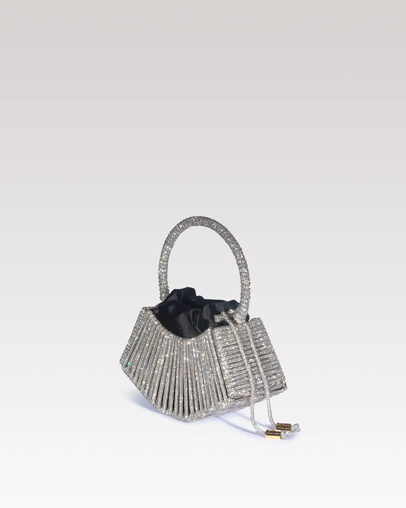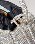 A contemporary jewel designed to shine during parties. Diamante features a rigid structure covered with iconic resin and crystal yarn, defined by a graphic and luminous design. Inside, a black satin pouch creates an elegant contrast, combining sculptural rigor and softness.